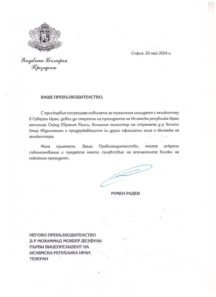 Condolence message of the Prime Minister and Minister of Foreign Affairs of Bulgaria to the Acting Minister of Foreign Affairs of Iran